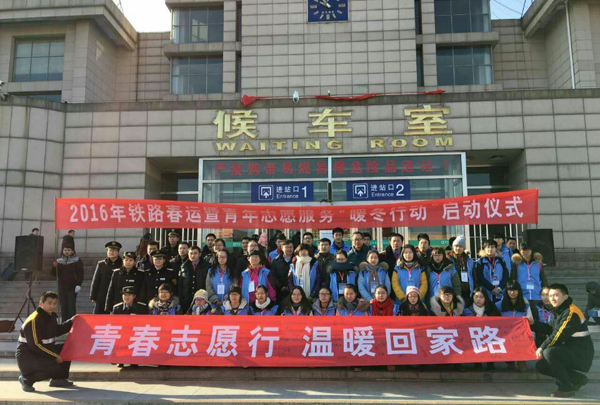1月24日,2016年铁路春运暨青年志愿服务“暖冬行动”启动仪式在泰山火车站举行。济南铁路局济南车务段、泰山站、泰安团市委和永利官网团委相关负责人出席活动。
