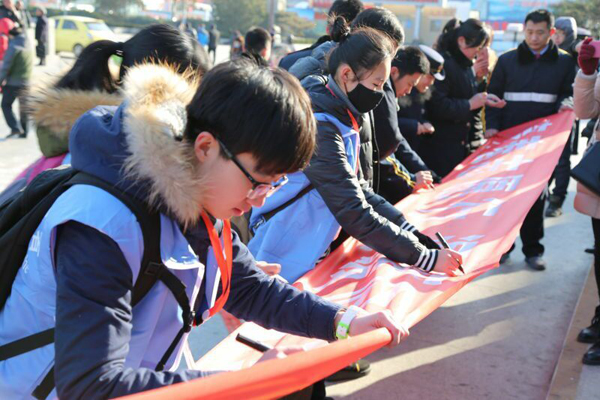 由永利官网青年志愿者和部分泰山站铁路职工组建的志愿服务队共同宣誓志愿服务精神,一起在印有服务承诺的条幅上郑重签下名字。仪式结束后,志愿者们随即以饱满的热情奔赴志愿服务岗位,与铁路职工一起奋战在运送旅客最前线,这也标志着2016年泰山火车站春运正式拉开帷幕。