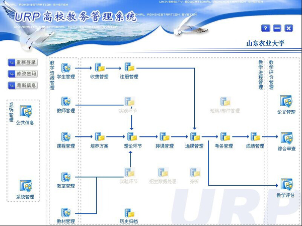 在软件方面,新教务系统较旧教务系统有了较大升级,底层数据结构有了很大改进,数据算法更加先进合理。新系统包括系统管理、教学资源管理、教学进程管理和教学评价管理等四大链条,除保留旧教务系统原有功能模块外,新增收费管理、注册管理、考务管理、教室管理、教材管理、论文管理、历史归档等功能模块,对教学计划、学籍、排课、选课、成绩管理、综合审查、教学评估等模块功能进一步优化,同时对师生网上客户端功能进一步扩充。新教务系统具有安全性更高、管理功能更强、运行速度更快,操作界面更人性化等优势。同时与收费管理、课程中心、实验室管理系统对接,为学分制管理等提供相应服务。