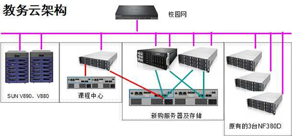 在硬件方面,为保证新教务系统及课程中心、实验室管理系统正常高效运行,并能最大限度利用现有仪器设备,通过与网络信息技术中心沟通,决定采用教务云架构,新购3台高性能服务器、1台云存储器与原有服务器、存储设备共同组成教务云,利用原有F5设备对师生网络访问端口做负载均衡,实现网络访问稳定高效。