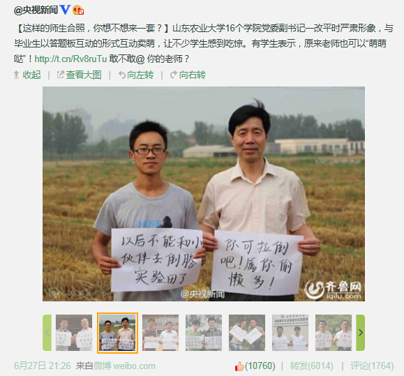 6月27日,新浪微博@人民日报以“山东农大16个学院的副书记卖萌合影送别毕业生”为题发布了博文,随后该微博被大量转载,一天之内的转发量超过2000。几乎与此同时,新浪微博@央视新闻以“这样的师生合照,你想不想来一套?”为题进行了报道,一天之内的点赞数超过10000,转发量超过6000。中国日报中文网全文刊登了系列照片,并配以评论。在此之前,人民网、光明网、新华网、中国青年网等中央媒体和腾讯网、温州网、华西都市报、东南快报、洛阳晚报、南方都市报、东南网等大批社会媒体纷纷报道。