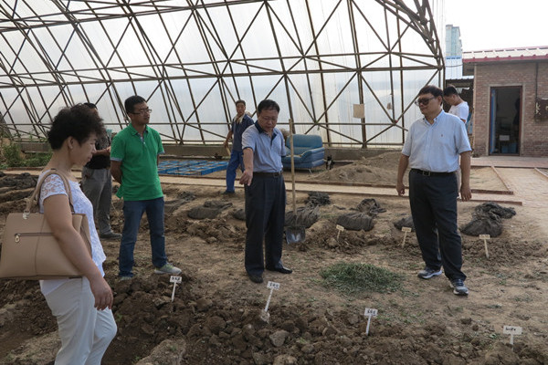 图为米庆华教授(右一)实地查看降解地膜埋设试验开展情况
