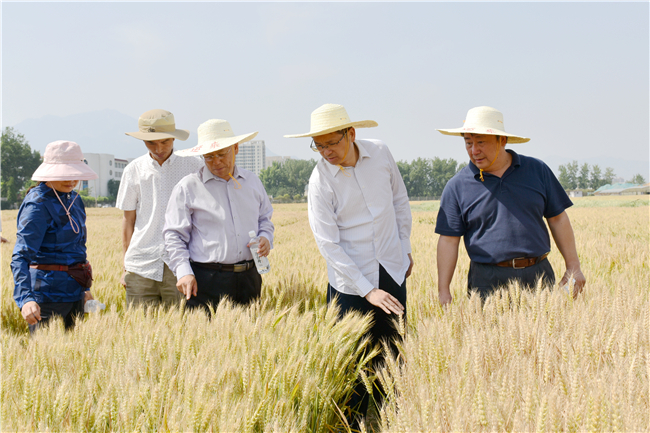 麦浪滚滚,麦香飘飘。6月2日,中国农业科学院作物科学研究所所长刘春明、党委书记范静等一行21人在校长张宪省的陪同下深入南校区农学院试验田、站园、宅子村等地查看小麦的长势,听取农学院负责人对不同小麦品种以及近期研究成果的介绍。