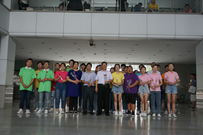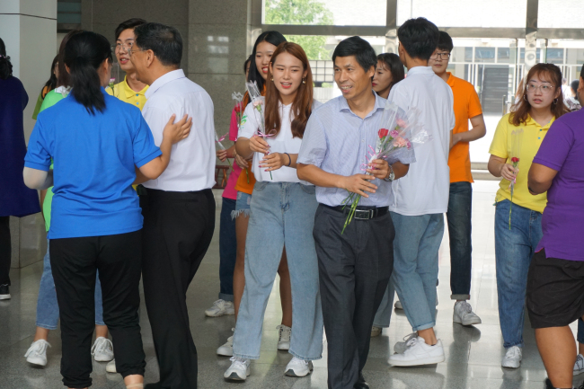 一场快闪,一份惊喜。教师节当天,校学生会为老师们准备了一份小小的惊喜,课间的综合楼大厅人来人往,伴随着音乐旋律响起,手捧鲜花的青年学生们簇成一团,高唱《每当我走过老师的窗前》,并为过往的老师们送上鲜花和祝福,老师们和围观同学也深受感染,纷纷加入快闪的行列,师生在一片祥和的气氛中合唱歌曲,共叙情谊,构成一幅师生同乐的美丽画卷。