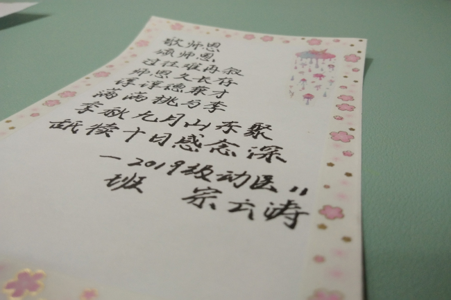 一首小诗,一片真情,农学院和动科学院的同学们别出心裁,用三行诗和现代诗等多种诗歌形式为老师们送上祝福。2018级中药同学们在课前为《中药资源学》的王建华老师朗诵了一首学生自己创作的小诗,王建华老师听完后非常感动,意味深长的跟大家讲:“我都忘了明天是教师节了,非常感谢同学们的祝福!我85年开始教课,当老师最自豪的事情就是看到学生成才,希望同学们都能成长成才!”