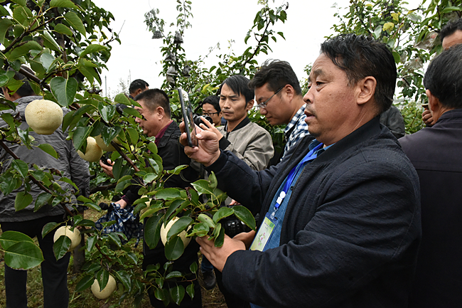 观摩会期间,100余名与会专家学者、企业代表、果农先后到冠县国有毛白杨林场“山农酥”梨培育基地、中华第一梨园等生产科研现场进行参观,对不同的梨品种进行品鉴。在“山农酥”梨培育基地,陈学森现场介绍了该新品种的选育新技术,讲解“山农酥”梨具有的酥脆多汁、耐贮藏、果个大、抗性强、鲜食品质与加工性能优良、极晚熟等优良特性,及其可满足高端市场周年供应需求的优势。与会人员纷纷拿出手机拍下树上的“山农酥”梨,与陈学森交流这一新品种梨的种植情况等。