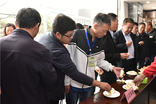 会议期间还进行了不同梨品种的品评与展示,其中“山农酥”梨赢得了与会代表的交口称赞,有不少参会企业、合作社负责人当场表示打算今年冬天就开始种植“山农酥”梨。菏泽市单县徐寨镇芦目村的农民孟宪启说:“我通过村里的第一书记了解到‘山农酥’梨这个新品种,慕名而来,品尝以后觉得它很甜、水分高、没渣、里面的核很小,口感好、个头大,今年就想种50亩,为村里的脱贫攻坚助上一把力。”
