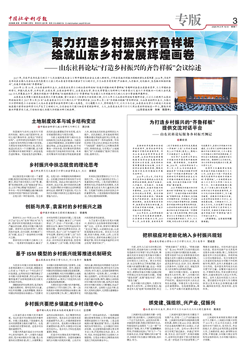 在这次专题报道中刊发了7篇文章,分别是《土地制度改革与城乡结构变迁》《乡村振兴中扶志脱贫的理论思考》《创新与共享:袁家村的乡村振兴之路》《基于ISM模型的乡村振兴统筹推进机制研究》《乡村振兴要把乡镇建成乡村治理中心》《把积极应对老龄化纳入乡村振兴规划》《抓党建、强组织、兴产业、促振兴》。山东省社科联还专门配发了为山东社科论坛撰写侧记稿件,认为论坛立足于经济社会发展实践,围绕关系国计民生的问题组织开展交流研讨,充分发挥在山东省学术研讨交流中的龙头带动作用,为地方经济社会发展出谋划策、提供学理支撑,为推动乡村振兴和打造乡村振兴的“齐鲁样板”提供了对话交流平台。