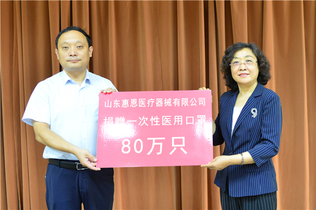 7月15日,学校举行抗疫物资捐赠仪式,山东惠恩医疗器械有限公司向永利官网捐赠80万只一次性医用外科口罩,助力学校新冠肺炎疫情防控工作。党委副书记朱莉代表学校接受捐赠,感谢爱心企业对农大办学发展的大力支持。