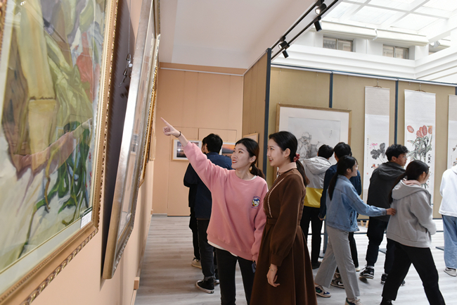 展览吸引不少师生前来观看。他们一边欣赏生动传神的作品,一边对作者高超的技能连连称赞。