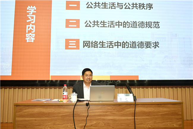 张宪省以“公共生活及其公共秩序”“公共生活中的道德规范”“网络生活中的道德要求”为主线,结合社会热点话题和学习生活中的生动事例,向在座同学阐释社会公德与公共生活密切相关,公共生活需要道德规范来约束和协调。他围绕“如何看待网络热点事件”“公共秩序靠什么维持和维护”等话题,与在座同学互动交流,要求在座学生自觉培养公德意识,养成遵守社会公德的良好行为习惯。