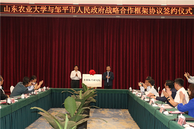 近日,学校与邹平市签署全面战略合作协议。校长张宪省出席签约仪式,与邹平市委书记皮台田、市长胡云江等座谈交流,并与邹平市委副书记王东共同为3044am永利官网(邹平)乡村振兴研究院揭牌。