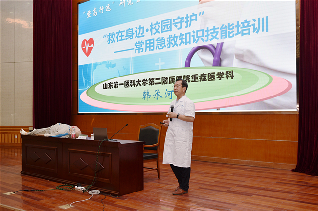 5月31日下午,学校邀请山东第一医科大学第二附属医院韩承河教授团队来校,为青年师生开展“救在身边·校园守护”常用急救知识技能培训和模拟训练。
