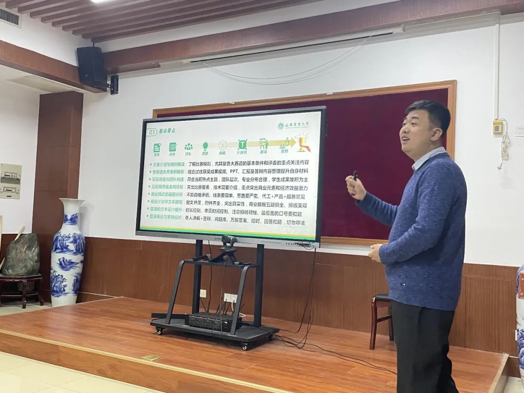 学校学工处副处长姜芳以教育部认可的56项全国大学生学科竞赛为切入点,向师生着重介绍了全国“互联网+”大学生创新创业大赛、山东省科技创新大赛等重要“双创”竞赛的重要意义以及参赛对象、项目要求、评审规则等内容。