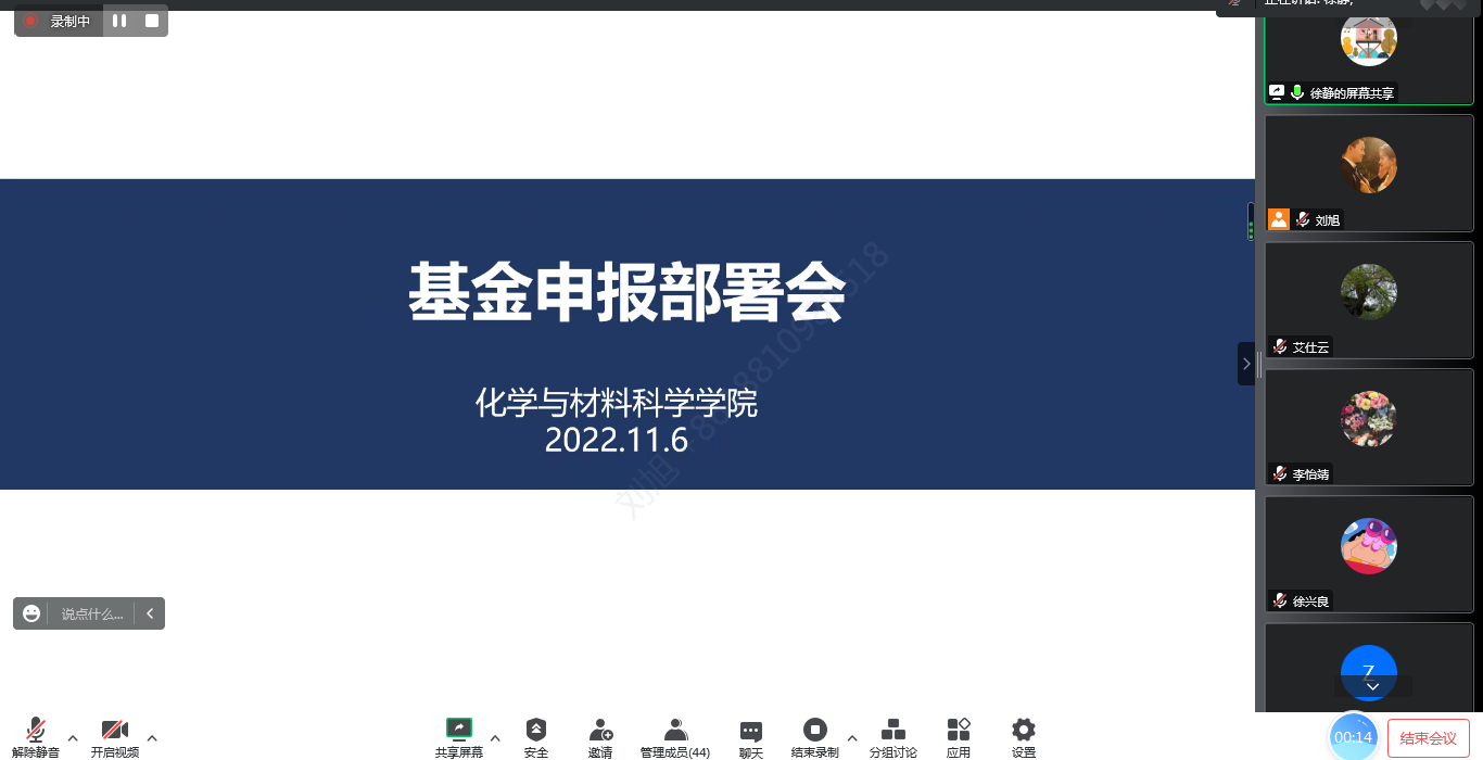 院长艾仕云做了总结发言,指出国家基金立项不仅是学校、学院、学科发展的重要支撑,对青年教师成长、职称晋升、提升科研能力也具有重要意义。要求中青年老师重视基金申报,注重文献阅读积累,凝练科学问题,梳理思路,做好长远规划。