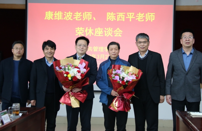 3月23日,公共管理学院为光荣退休的康维波老师、陈西平老师举行荣休仪式。学院领导班子和各系(室)主任、党支部书记等教师代表汇聚一堂,热烈欢送两位老师光荣退休。