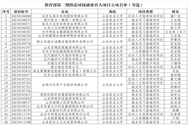 教育部第二期供需对接就业育人项目是贯彻落实党中央、国务院“稳就业”“保就业”决策部署,深化产教融合、校企合作,推动人才培养与就业的有机联动、人才供需有效对接的有力举措。2022年10月,教育部发布申报指南后,学校高度重视,积极动员,经过与用人单位的主动对接、反复沟通、协商合作,最终28个项目获批立项,涉及农林、信息通讯与互联网、装备制造、教育、能源动力、材料化工、科技服务、商贸服务与生活消费和医药卫生等多个行业。
