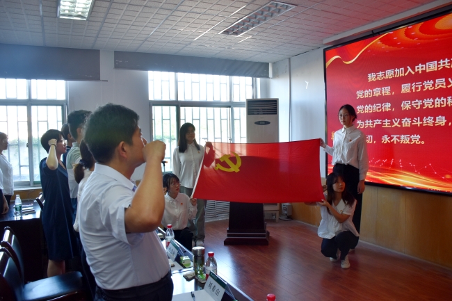 “我志愿加入中国共产党,拥护党的纲领,遵守党的章程,履行党员义务,执行党的决定……”与会党员以饱满的热情和昂扬的姿态,面向党旗庄严宣誓,抒发对党忠诚的决心,立下为党的事业奋斗终身的光荣承诺和铮铮誓言。刘希山为新发展党员佩戴党徽、发放党章。他说,佩戴的党徽、手持的《中国共产党章程》,是一种荣誉、是一种激励,更是一种鞭策。他要求全体党员要时刻牢记党员身份,充分发挥党员的先锋模范作用、骨干带头作用、文明示范作用,以亮身份、作表率的实际行动亮化党员形象,争做优秀共产党员。
