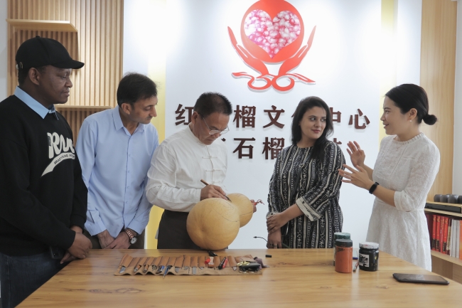 品尝月饼后,留学生来到“红石榴文创中心”,现场欣赏了泰安市非物质文化遗产传承人杨秀文老师的葫芦雕刻艺术,通过泰山文创作品感受泰山文化魅力。活动中,他们积极与杨老师互动交流,不时拍摄图片和视频进行记录。留学生乌鲁萨表示,“这次的体验很棒!中国传统文化魅力无穷,我们希望有更多的机会参加这种有意义、有价值的文化体验活动,更多更好更全面地感知中国、认识中国、传播中国。”